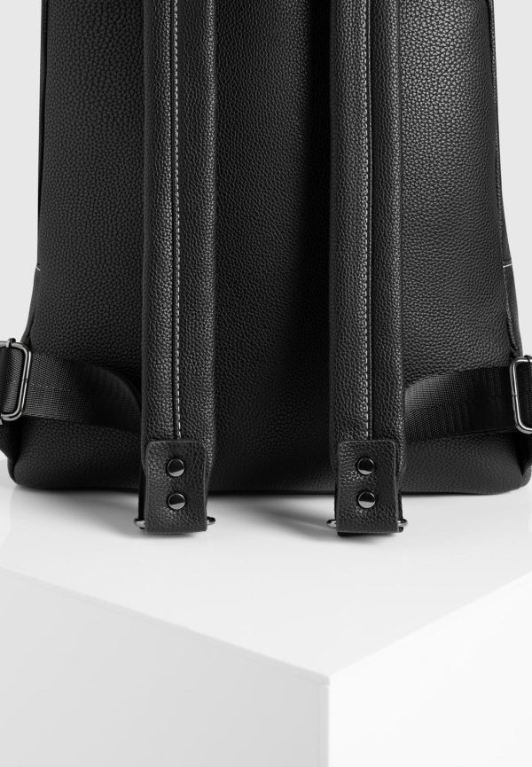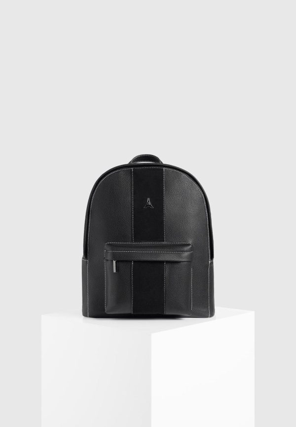 The Lyon Suede Panel Backpack in Black combines refined design with functional utility, crafted from premium pebbled leather with a central suede panel for added texture. The spacious main compartment easily holds essentials, including a laptop, while a front zippered pocket offers quick access to smaller items. Reinforced with whipstitch detailing, this sleek black backpack is an essential for both professional and casual settings.