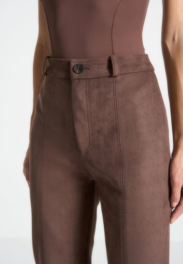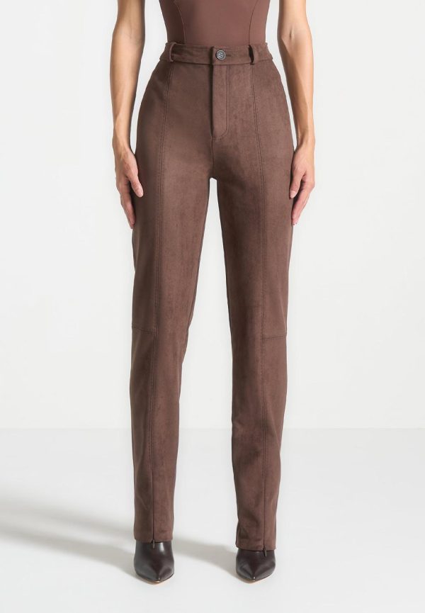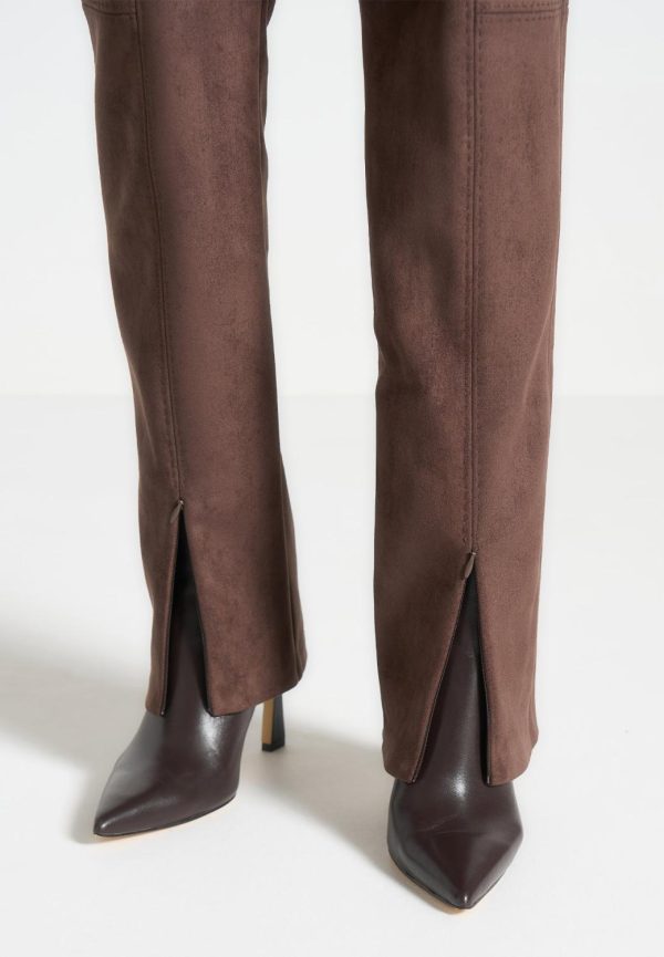 Expertly crafted from soft suede, these black trousers feature a split hem and topstitching detailing for a polished finish. With a straight leg silhouette, they offer a classic and sophisticated look, perfect for any occasion. Elevate your wardrobe with these versatile trousers that exude both comfort and style.