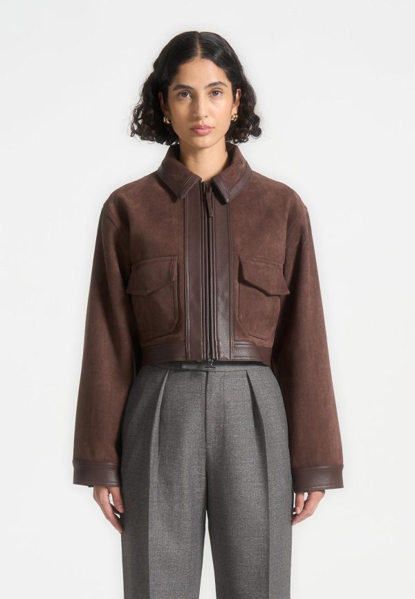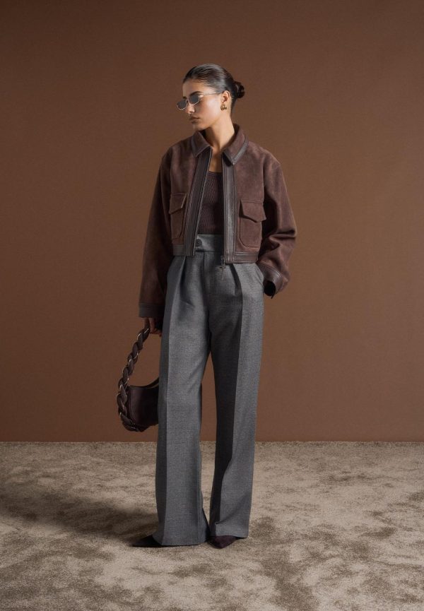 This Suede and Pebbled Leather Jacket is designed for a relaxed fit. It combines the luxurious softness of suede with the bold texture of pebbled leather, offering a unique blend of comfort and durability. The jacket features sleek leather trim detailing that adds a touch of sophistication, while the classic collar provides timeless appeal