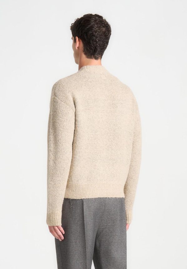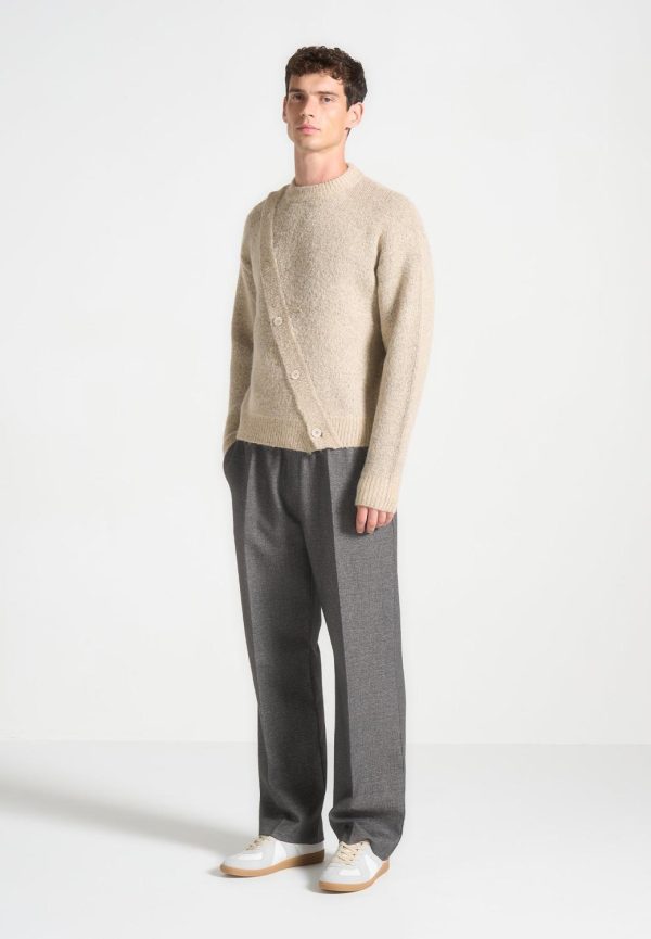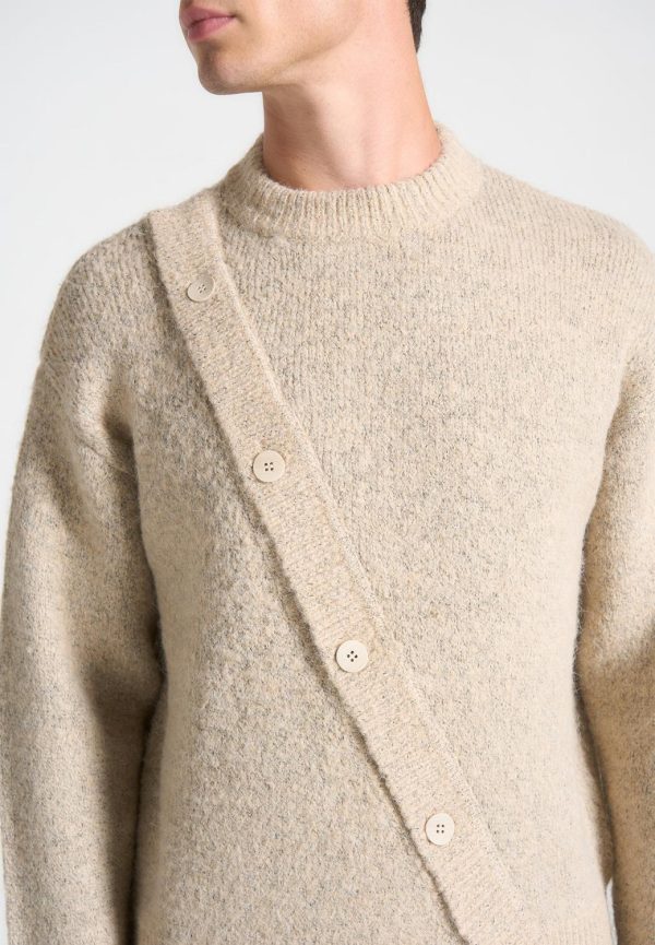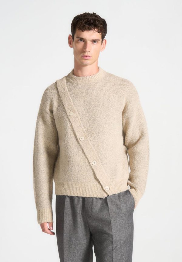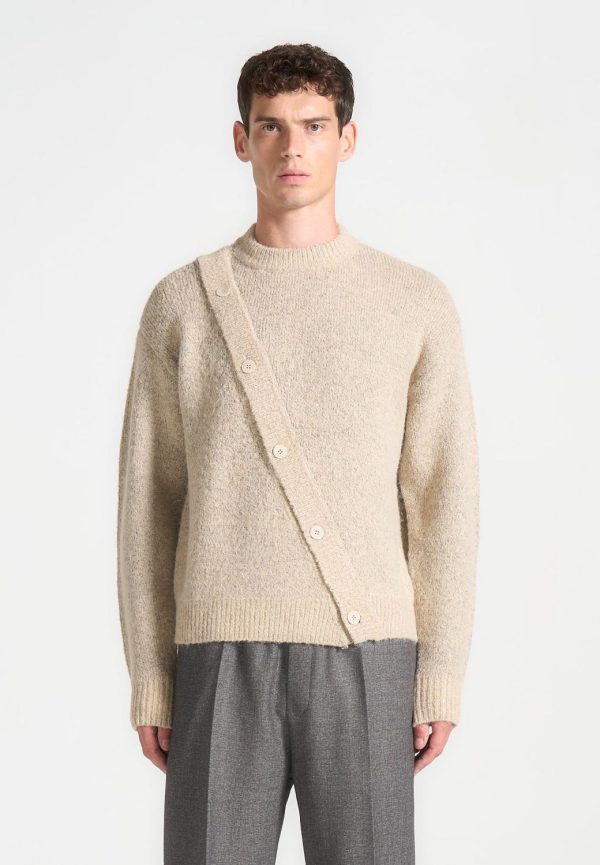 The Asymmetric Brushed Wool Knit Jumper in Beige redefines classic knitwear with a contemporary edge. Crafted from luxuriously soft wool, it boasts a striking diagonal button-up design that adds a refined, asymmetric touch. The brushed texture enhances its cosy feel, while the relaxed crewneck silhouette ensures effortless comfort. Perfect for layering or making a statement on its own, this jumper is a versatile essential for elevating your seasonal wardrobe.
