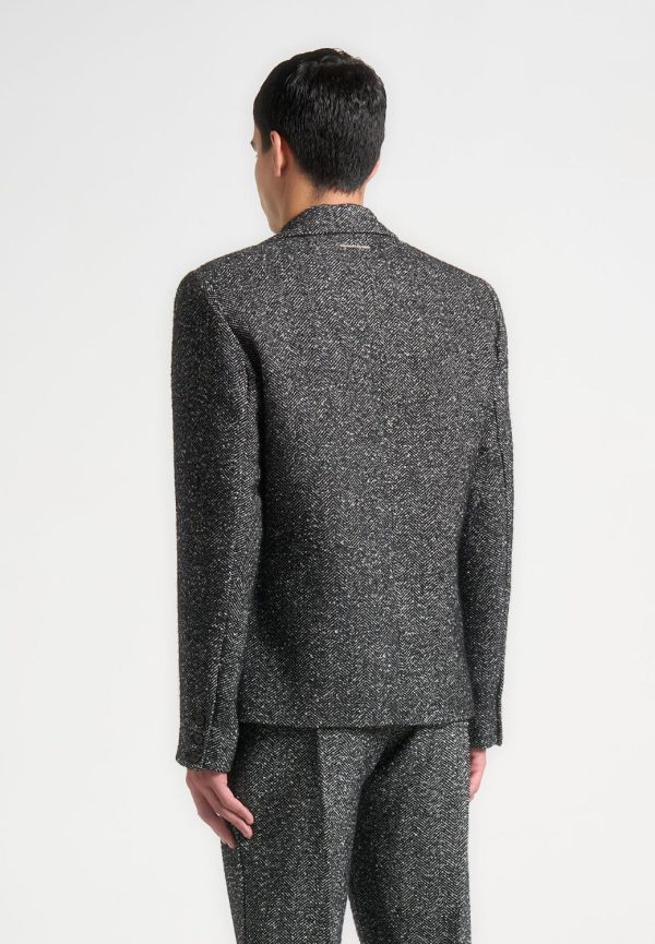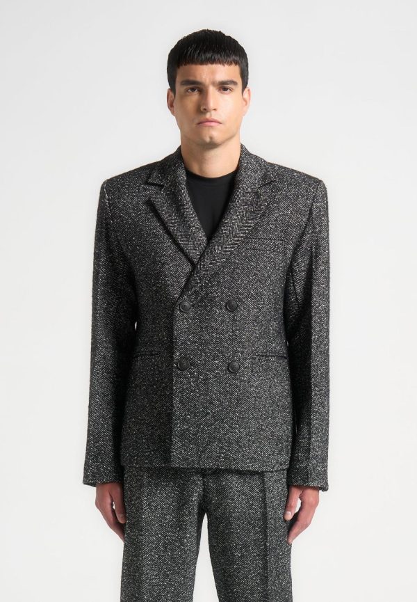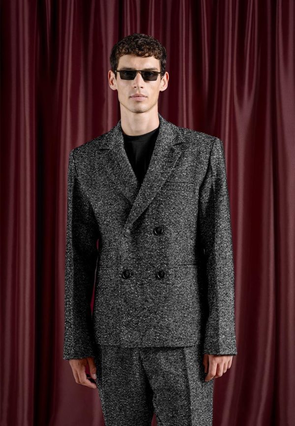 The Double Breasted Herringbone Suit Jacket in Black offers a relaxed fit with a sleek, contemporary design. Featuring a classic blazer silhouette, it combines practicality with style. The durable fabric, made from a 50% wool and 50% polyester blend, ensures both comfort and warmth. Pair with the Regular Fit Herringbone Tailored Trousers in Black for a complete ensemble.