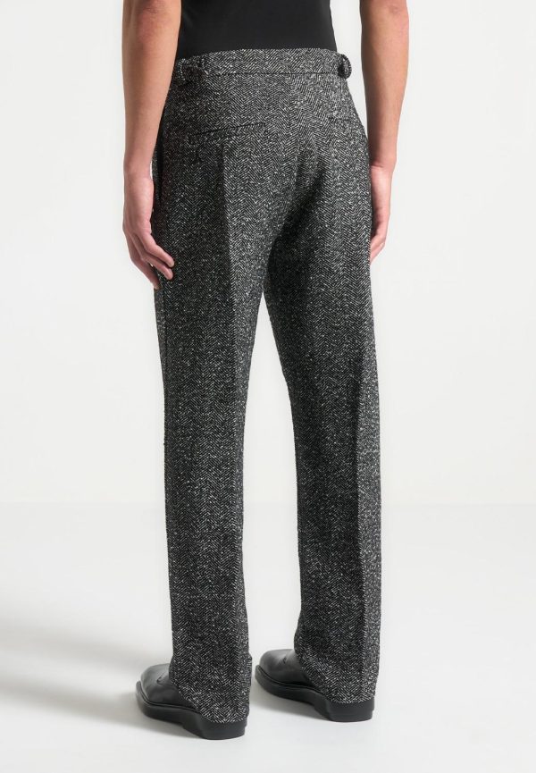 The Relaxed Fit Herringbone Pleated Trousers in Black offer a modern touch to a classic herringbone print. Designed with side adjusters for a customisable fit and a single pleat for a refined look, these durable trousers are made from a blend of 50% wool and 50% polyester. Pair with the Boxy Herringbone Jacket for a seamless look.