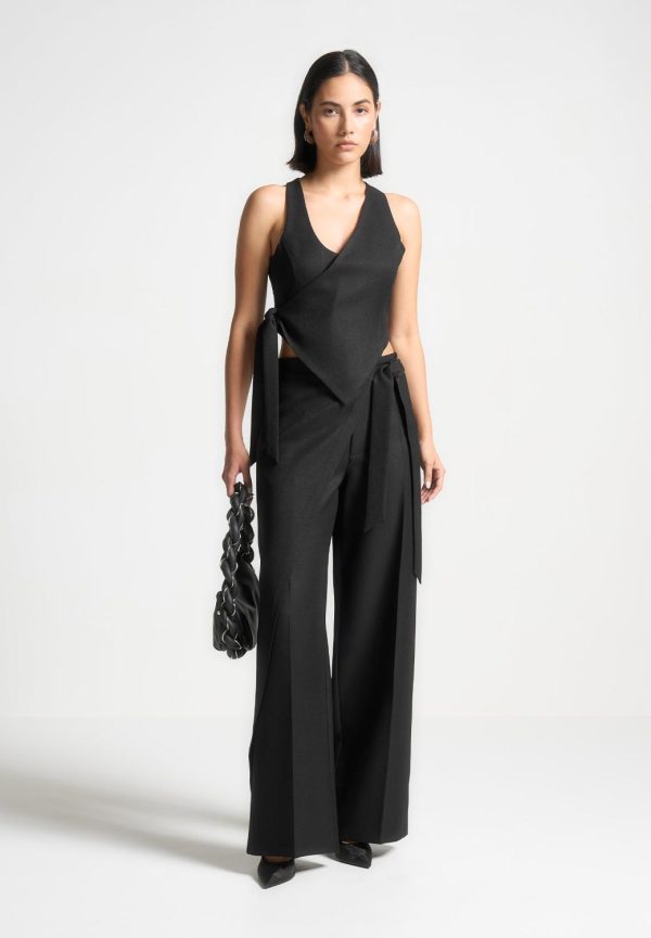 Expertly crafted with a wrap detail for a sophisticated touch, these tailored trousers in light beige feature a convenient tie closure and a modern wide leg design. Elevate your wardrobe with these stylish and versatile trousers that offer both comfort and style.