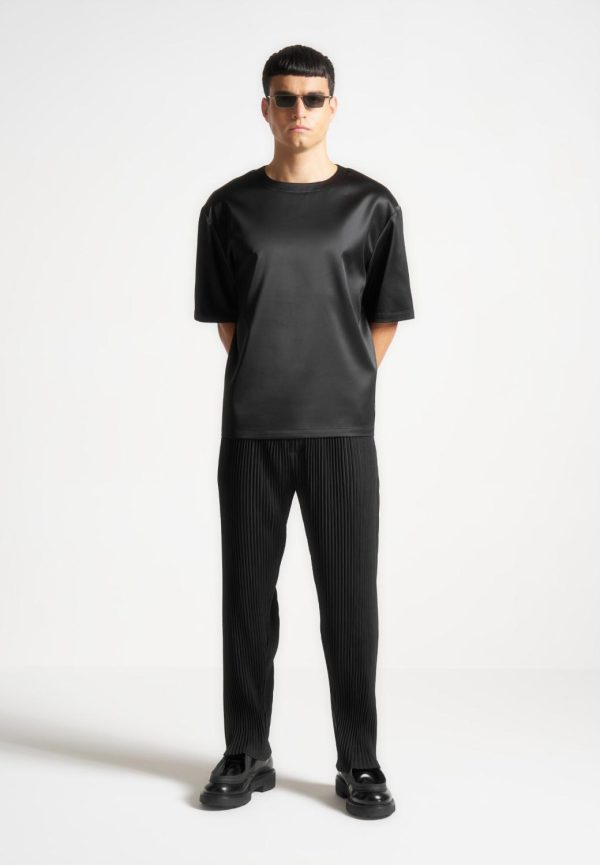 Introducing our Satin Boxy Fit T-Shirt in Black. Crafted with a smooth satin texture, this shirt offers a sleek and modern addition to your casual attire. The relaxed, boxy fit and short sleeve silhouette ensure all-day comfort without compromising on style.